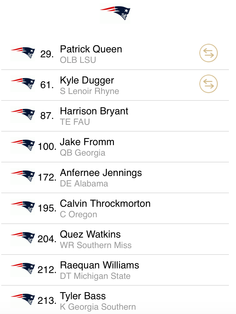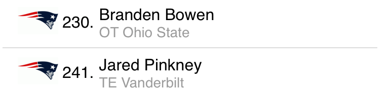 Like Jennings, I drafted Bass in my last mock. Despite that I’m not sold on the fact that the Patriots will take Bass, or Rodrigo Blankenship for that matter. Unfortunately they’re the only two options given in the simulator I use. Keep an eye out on guys like Ricky Aguayo out of Florida St. and Jace Christmann out of Miss. State. Adam Vinatieri’s nephew Chase is also an option.